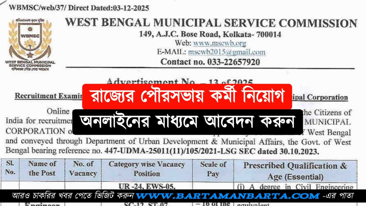 WBMSC Recruitment 2025: রাজ্যের পৌরসভায় কর্মী নিয়োগ, আবেদন চলবে 31 ডিসেম্বর পর্যন্ত